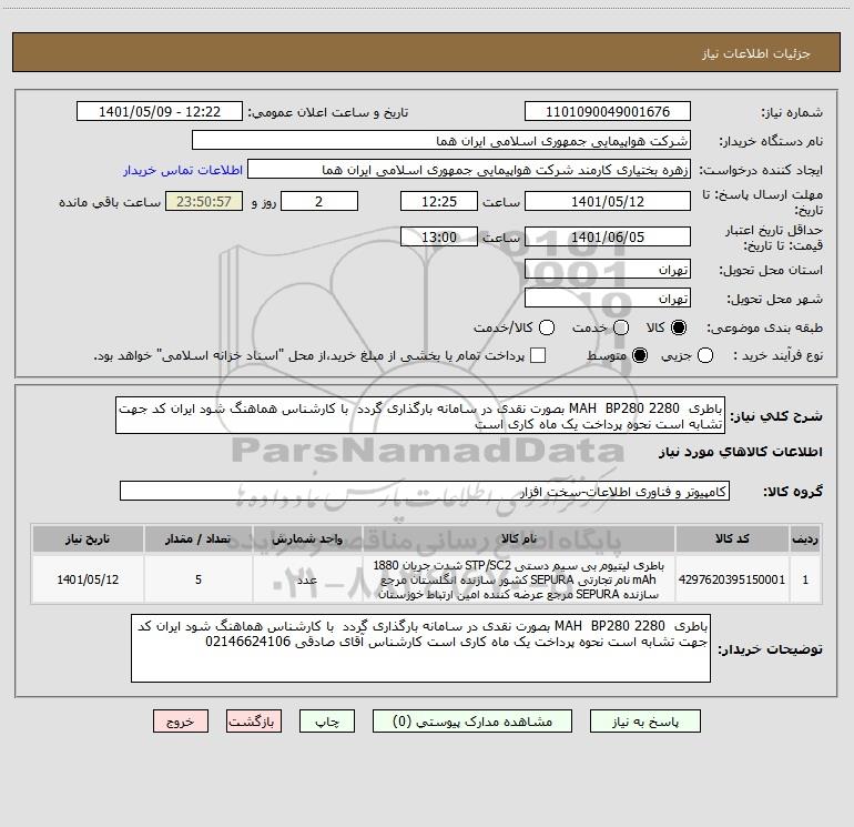 استعلام باطری 2280 MAH BP280 بصورت نقدی در سامانه بارگذاری گردد با کارشناس هماهنگ شود ایران کد جهت تشابه است نحوه پرداخت یک ماه کاری است, استعلام باطری 2280 MAH BP280 بصورت نقدی در سامانه بارگذاری گردد با کارشناس هماهنگ شود ایران کد جهت تشابه است نحوه پرداخت یک ماه کاری است