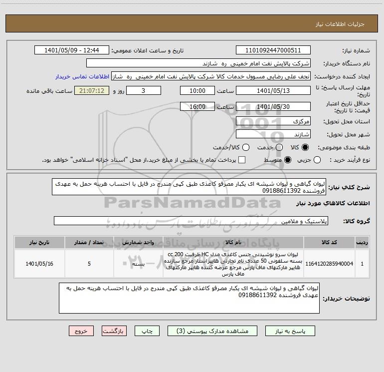 شرح کلی نیاز: لیوان گیاهی و لیوان شیشه ای یکبار مصرفو کاغذی طبق کپی مندرج در فایل با احتساب هرینه حمل به عهدی فروشنده 09188611392