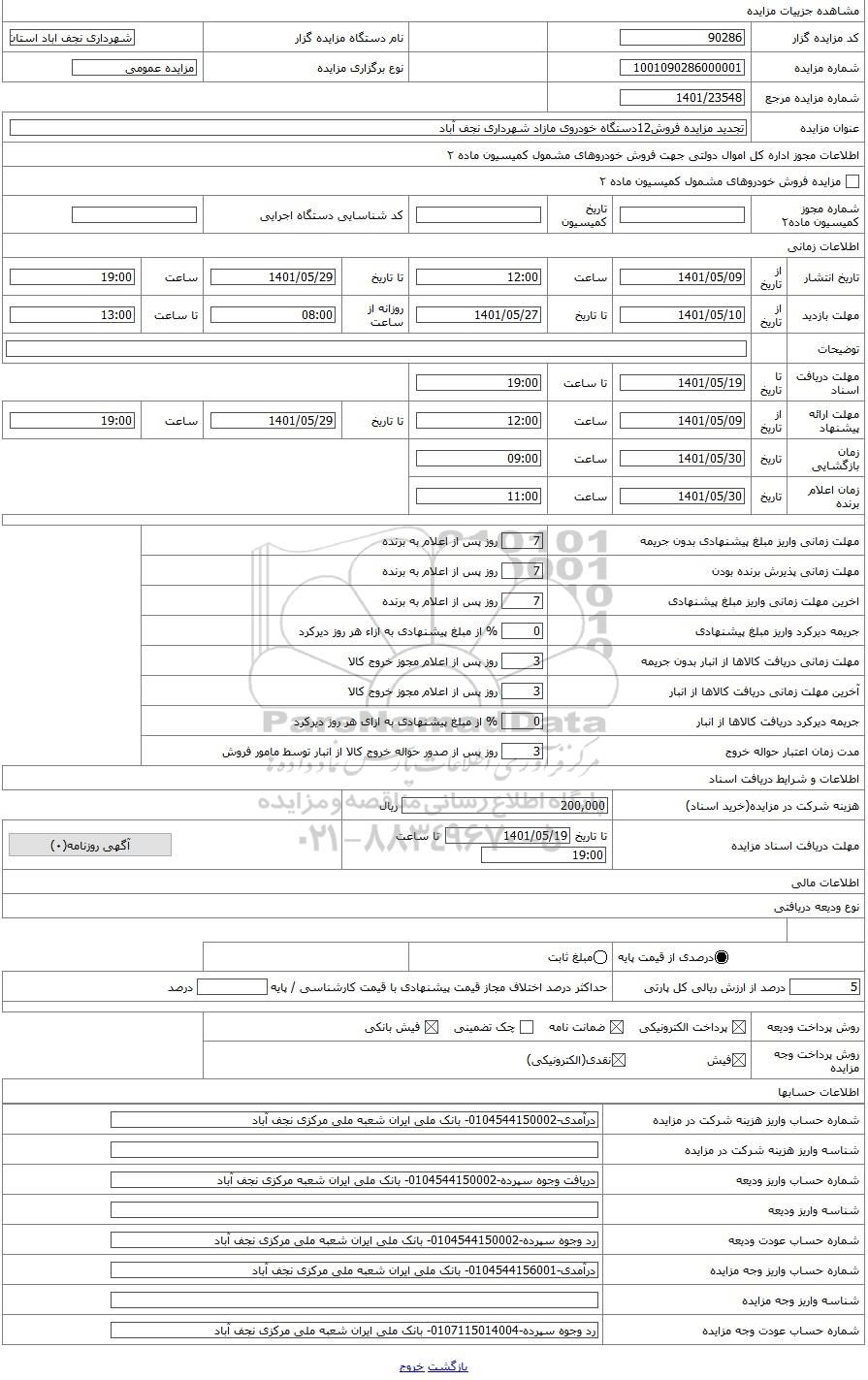 | شماره حساب واریز وجه مزایده | درآمدی-0104544156001- بانک ملی ایران شعبه ملی مرکزی نجف آباد |