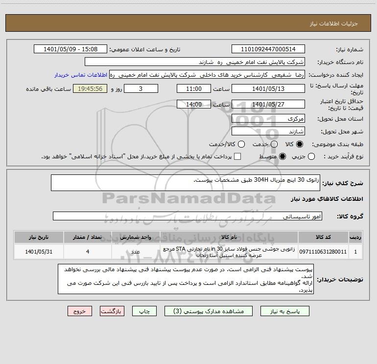 شرح کلی نیاز: زانوی 30 اینچ متریال 304H طبق مشخصات پیوست.