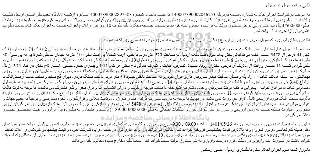 به موجب درخواست اجرای حکم به شماره دادنامه مربوطه 140007390002046253 که حسب دادنامه شماره 140007390002897583صادره ازشعبه 7دادگاه تجدیدنظر استان اردبیل قطعیت یافته است حکم به فروش ملک موصوف به شرح نظریه هیئت کارشناسی سه نفره به طریق مزایده و تقسیم وجوه آن بین ورثه وفق گواهی حصر وراثت صادر ومحکوم علیهما محکومند به  پرداخت مبلغ 1/500/000ریال نیم عشردولتی درحق صندوق دولت که برعهده محکوم علیه خواهد بودضمنا چنانچه محکوم علیه ظرف 10روز پس ازابلاغ اجرائیه نسبت به اجرای حکم اقدام ننماید مبلغ نیم عشردولتی ازنامبرده اخذ خواهد شد .
