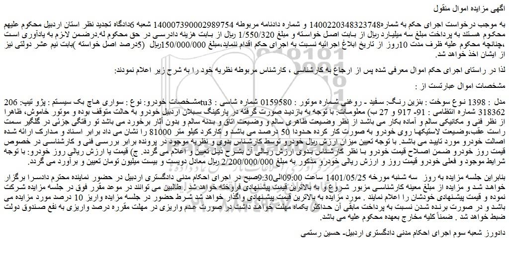 مشخصات خودرو: نوع : سواری هاچ بک سیستم : پژو تیپ: 206tu3 مدل : 1398 نوع سوخت : بنزین رنگ: سفید - روغنی شماره موتور : 0159580 شماره شاسی : 318362 شماره انتظامی : 91- 917 و 27 ب) معلومات: با توجه به بازدید صورت گرفته در پارکینگ سبلان اردبیل خودرو به حالت متوقف بوده و موتور خاموش، ظاهرا از نظر فنی و مکانیکی سالم و آماده بکار می باشد از نظر وضیعت ظاهری سالم و وضیعت اتاق و بدنه سالم و بدون آثار برخورد می باشد تو رفتگی جزئی در گلگیر سمت راست عقب،وضیعت لاستیکها روی خودرو به صورت کار کرده حدودا 50 درصد می باشد و کارکرد کیلو متر 81000 را نشان می داد برابر اسناد و مدارک ارائه شده اصالت خودرو مورد تایید می باشد. با توجه تعیین میزان ارزش ریال خودرو توسط کارشناس بدوی و نظریه موجود در پرونده برابر بررسی فنی و کارشناسی در خصوص قیمت روز خودرو ضمن اصلاح قیمت خودرو با نظر کارشناس بدوی ارزش ریالی آن بشرح ذیل تعیین و اعلام می گردد. ج) قیمت یا ارزش ریالی روز خودرو: با توجه شرایط موجود و فعلی خودرو قیمت روز و ارزش ریالی خودرو مذکور به مبلغ 2/200/000/000 ریال معادل دویست و بیست میلیون تومان تعیین و برآورد می گردد.