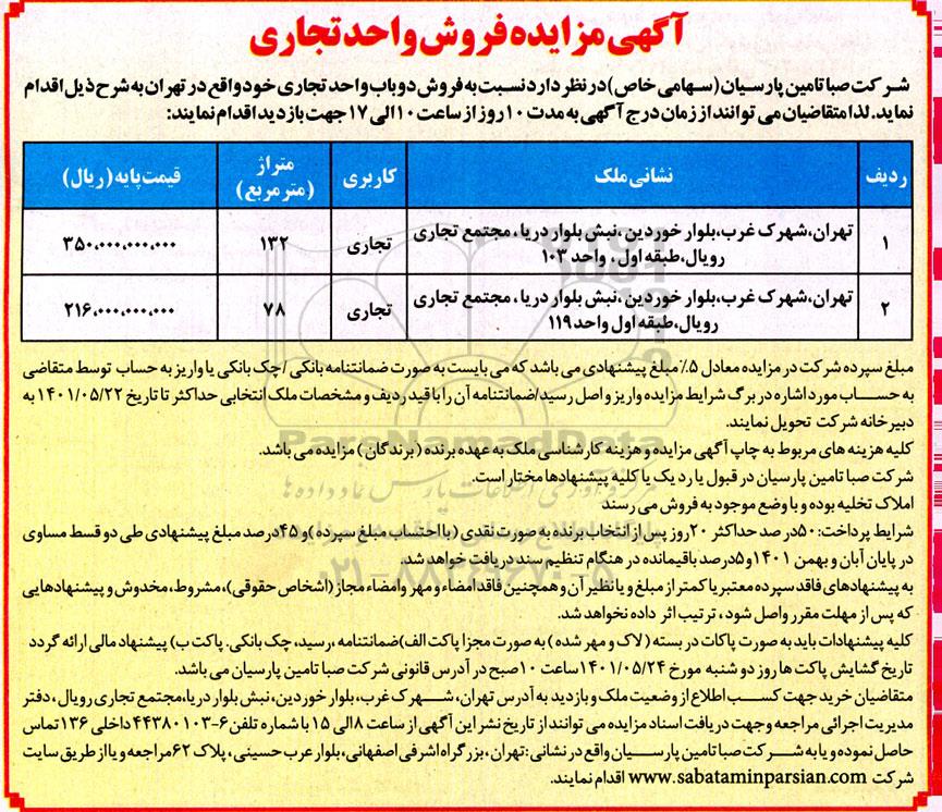 شرکت صبا تامین پارسیان سهامی خاص در نظر دارد نسبت به فروش دو باب واحد تجاری خود واقع در تهران به شرح ذیل اقدام نمناید لذا متقاضیان می توانند از زمان درج آگهی به مدت 10 روز از ساعت 10 الی 17 جهت بازدید اقدام نمایند