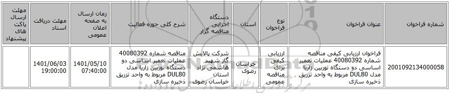 | 2001092134000058 | فراخوان ارزیابی کیفی مناقصه شماره 40080392 عملیات تعمیر اساسی دو دستگاه توربین زاریا مدل DUL80 مربوط به واحد تزریق ذخیره سازی | ارزیابی کیفی برای مناقصه عمومی | خراسان رضوی | شرکت پالایش گاز شهید هاشمی نژاد استان خراسان رضوی | مناقصه شماره 40080392 عملیات تعمیر اساسی دو دستگاه توربین زاریا مدل DUL80 مربوط به واحد تزریق ذخیره سازی | 1401/05/10 07:40:00 | 1401/06/03 19:00:00 |