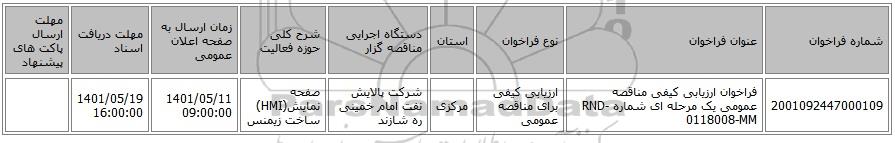 | 2001092447000109 | فراخوان ارزیابی کیفی مناقصه عمومی یک مرحله ای شماره RND-0118008-MM | ارزیابی کیفی برای مناقصه عمومی | مرکزی | شرکت پالایش نفت امام خمینی ره شازند | صفحه نمایش(HMI) ساخت زیمنس | 1401/05/11 09:00:00 | 1401/05/19 16:00:00 |