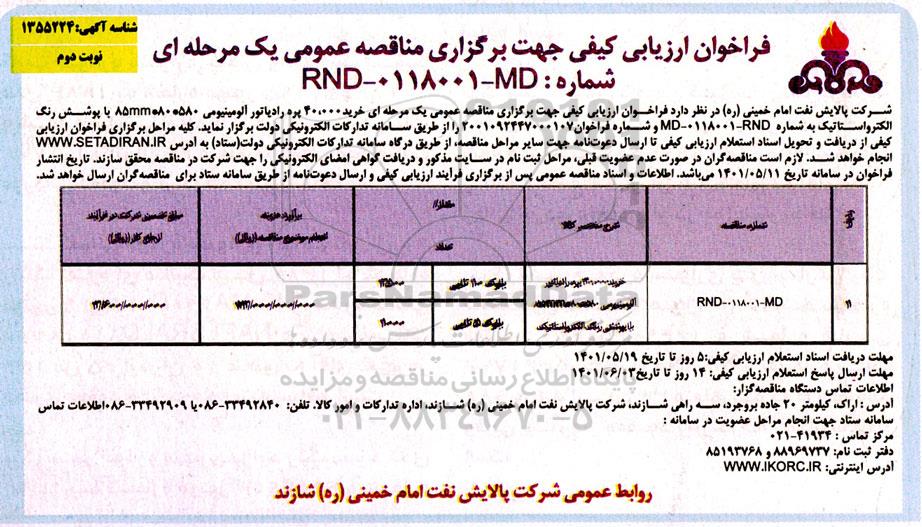فراخوان ارزیابی کیفی جهت برگزاری مناقصه عمومی یک مرحله ای شماره RND - 0118001 - MD ؟