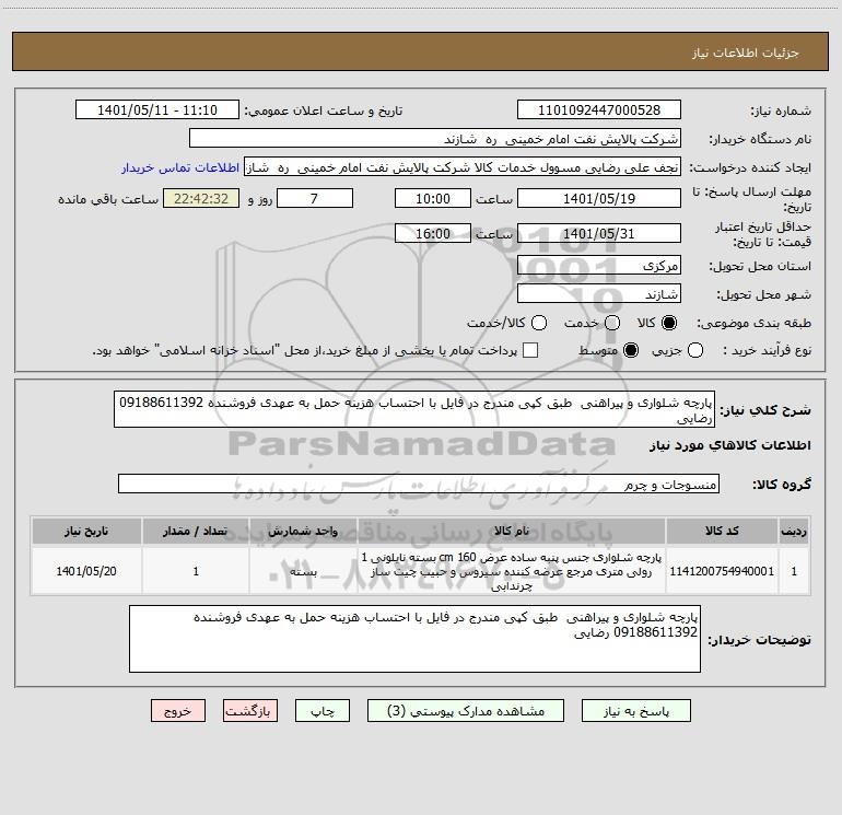 شرح کلی نیاز: پارچه شلواری و پیراهنی طبق کپی مندرج در فایل با احتساب هزینه حمل به عهدی فروشنده 09188611392 رضایی