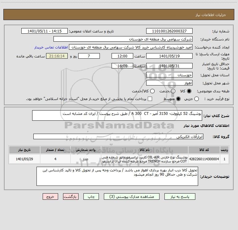 شرح کلی نیاز: بوشینگ 52 کیلوولت- 3150 آمپر - A 300 CT / طبق شرح پیوست / ایران کد مشابه است