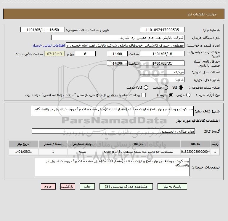 شرح کلی نیاز: بیسکویت جومانه درچهار طمع و اوزان مختلف (مقدار 62000)طبق مشخصات برگ پیوست تحویل در پالایشگاه