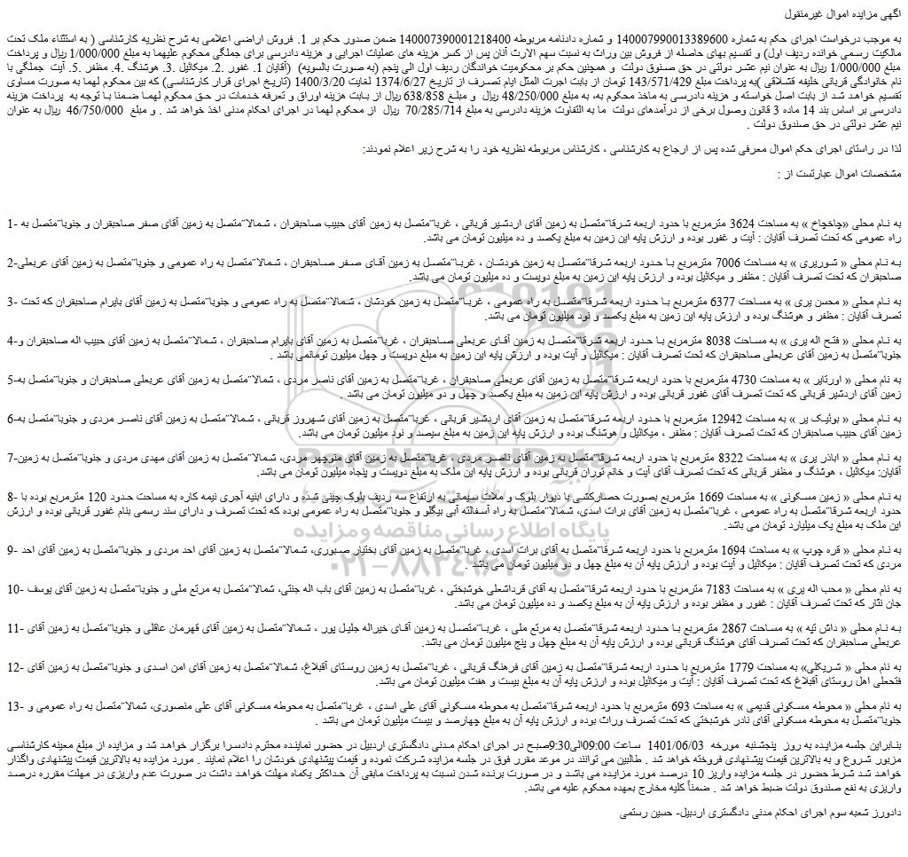 به موجب درخواست اجرای حکم به شماره 140007990013389600 و شماره دادنامه مربوطه 140007390001218400 ضمن صدور حکم بر 1. فروش اراضی اعلامی به شرح نظریه کارشناسی ( به استثناء ملک تحت مالکیت رسمی خوانده ردیف اول) و تقسیم بهای حاصله از فروش بین وراث به نسبت سهم الارث آنان پس از کسر هزینه های عملیات اجرایی و هزینه دادرسی برای جملگی محکوم علیهما به مبلغ 1/000/000 ریال و پرداخت مبلغ 1/000/000 ریال به عنوان نیم عشر دولتی در حق صنوق دولت و همچنین حکم بر محکومیت خواندگان ردیف اول الی پنجم (به صورت بالسویه) (آقایان 1. غفور .2. میکائیل .3. هوشنگ .4. مظفر .5. آیت جملگی با نام خانوادگی قربانی خلیفه قشلاقی )به پرداخت مبلغ 143/571/429 تومان از بابت اجرت المثل ایام تصرف از تاریخ 1374/6/27 لغایت 1400/3/20 (تاریخ اجرای قرار کارشناسی) که بین محکوم لهما به صورت مساوی تقسیم خواهد شد از بابت اصل خواسته و هزینه دادرسی به ماخذ محکوم به، به مبلغ 48/250/000 ریال و مبلغ 638/858 ریال از بابت هزینه اوراق و تعرفه خدمات در حق محکوم لهما ضمنا با توجه به پرداخت هزینه دادرسی بر اساس بند 14 ماده 3 قانون وصول برخی از درآمدهای دولت ما به التفاوت هزینه دادرسی به مبلغ 70/285/714 ریال از محکوم لهما در اجرای احکام مدنی اخذ خواهد شد . و مبلغ 46/750/000 ریال به عنوان نیم عشر دولتی در حق صندوق دولت .
