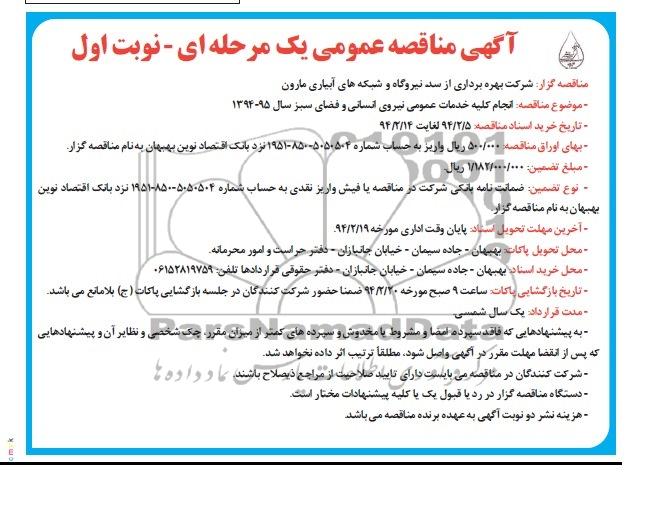 موضوع مناقصه : انجام کلیه خدمات عمومی نیروی انسانی و فضای سبز سال 95-94