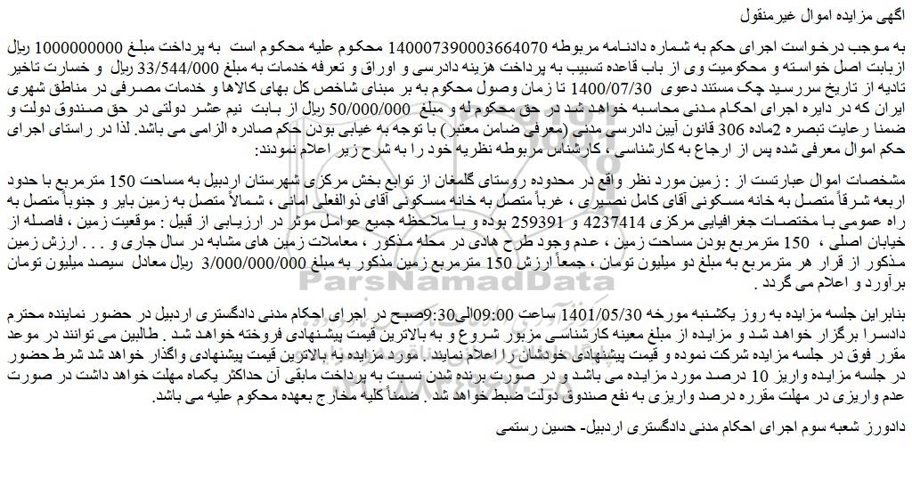 شعبه صادر کننده:شعبه سوم اجرای احکام مدنی دادگستری شهرستان اردبیل