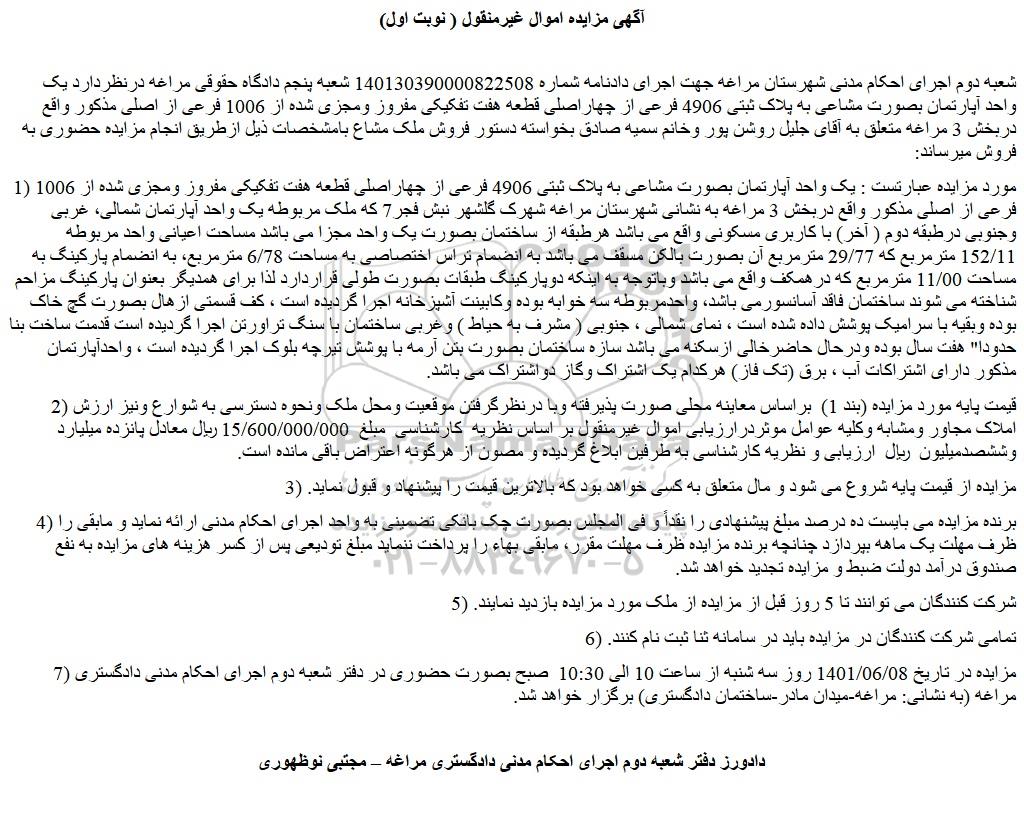 شعبه دوم اجرای احکام مدنی شهرستان مراغه جهت اجرای دادنامه شماره 140130390000822508 شعبه پنجم دادگاه حقوقی مراغه درنظردارد یک واحد آپارتمان بصورت مشاعی به پلاک ثبتی 4906 فرعی از چهاراصلی قطعه هفت تفکیکی مفروز ومجزی شده از 1006 فرعی از اصلی مذکور واقع دربخش 3 مراغه متعلق به آقای جلیل روشن پور وخانم سمیه صادق بخواسته دستور فروش ملک مشاع بامشخصات ذیل ازطریق انجام مزایده حضوری به فروش میرساند: