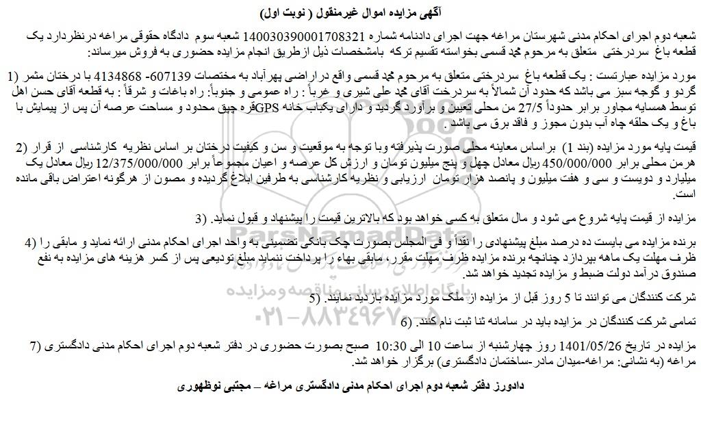 شعبه دوم اجرای احکام مدنی شهرستان مراغه جهت اجرای دادنامه شماره 140030390001708321 شعبه سوم دادگاه حقوقی مراغه درنظردارد یک قطعه باغ سردرختی متعلق به مرحوم محمد قسمی بخواسته تقسیم ترکه بامشخصات ذیل ازطریق انجام مزایده حضوری به فروش میرساند: