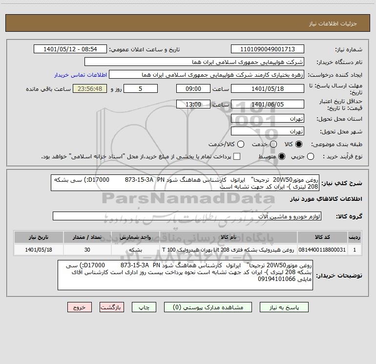 شرح کلی نیاز: روغن موتور20W50 ترجیحا" ایرانول کارشناس هماهنگ شود D17000 873-15-3A PN:) سی بشکه 208 لیتری )- ایران کد جهت تشابه است
