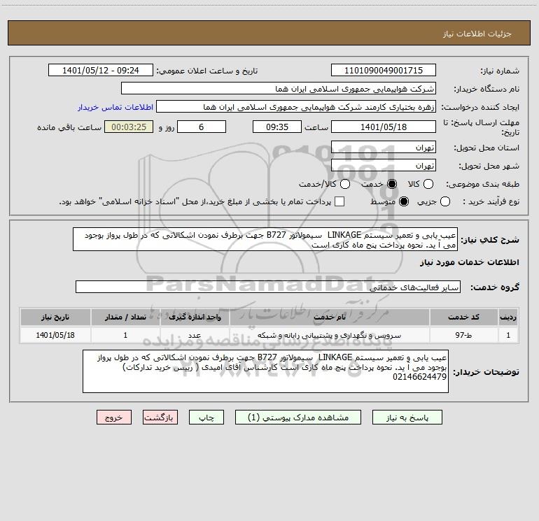 استعلام عیب یابی و تعمیر سیستم LINKAGE سیمولاتور B727 جهت برطرف نمودن اشکالاتی که در طول پرواز بوجود می آ ید. نحوه پرداخت پنج ماه کاری است, استعلام عیب یابی و تعمیر سیستم LINKAGE سیمولاتور B727 جهت برطرف نمودن اشکالاتی که در طول پرواز بوجود می آ ید. نحوه پرداخت پنج ماه کاری است