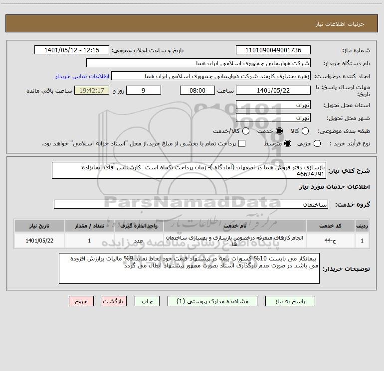 شرح کلی نیاز: بازسازی دفتر فروش هما در اصفهان (آمادگاه )- زمان پرداخت یکماه است کارشناس آقای ایمانزاده 46624291