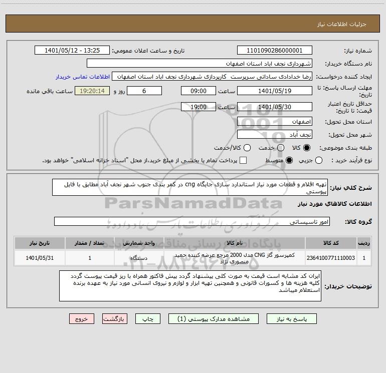 شرح کلی نیاز: تهیه اقلام و قطعات مورد نیاز استاندارد سازی جایگاه cng در کمر بندی جنوب شهر نجف آباد مطابق با فایل پیوستی