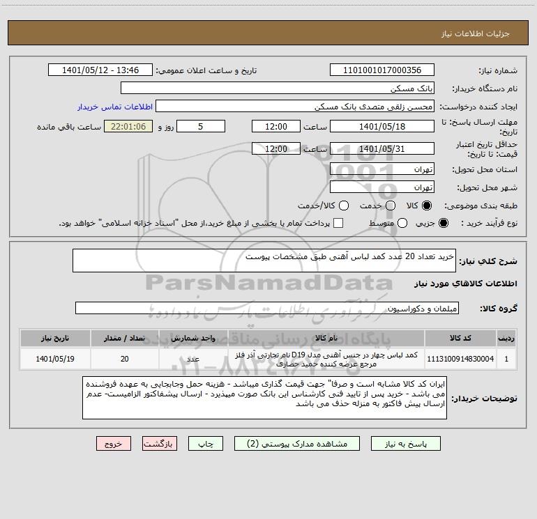 شرح کلی نیاز: خرید تعداد 20 عدد کمد لباس آهنی طبق مشخصات پیوست