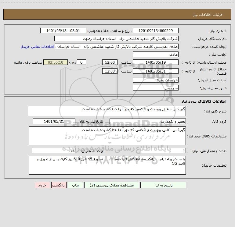 نام دستگاه خریدار:شرکت پالایش گاز شهید هاشمی نژاد استان خراسان رضوی