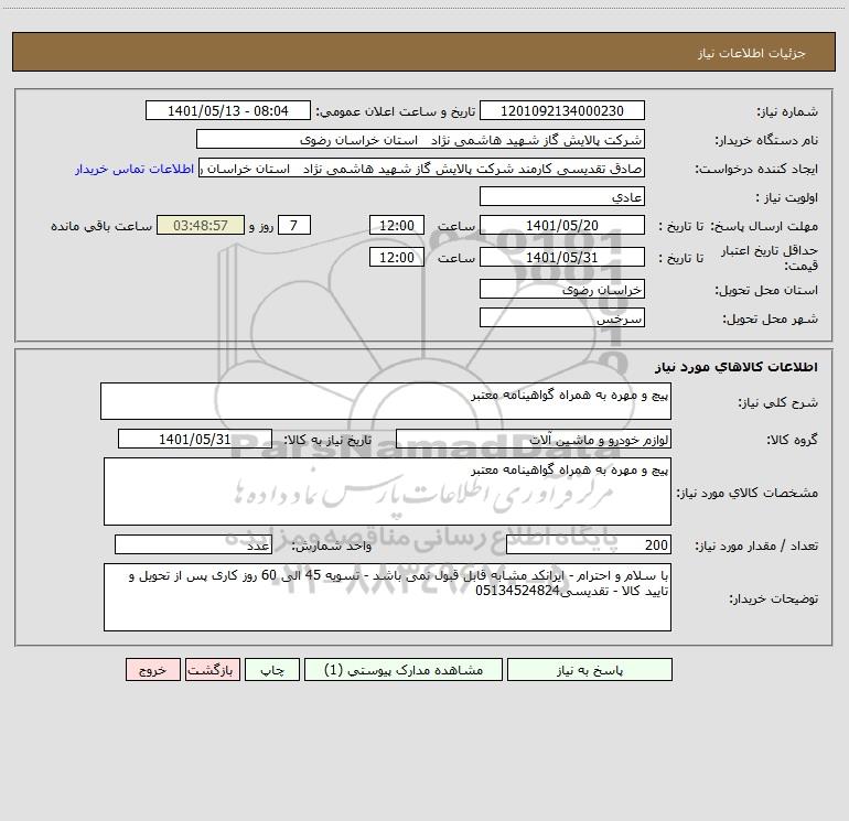 نام دستگاه خریدار:شرکت پالایش گاز شهید هاشمی نژاد استان خراسان رضوی