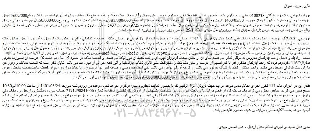 پرونده اجرایی به شماره  بایگانی 0100238 مبنی بر محکوم علیه : منصورخدائی خلیفه قشلاقی، محکوم له:وحید عابدی وکیل آباد محکو میت محکوم علیه به مبلغ یک میلیارد ریال اصل خواسته وپرداخت ومبلغ34/609/000ریال هزینه دادرسی وخسارت تاخیر تادیه از سررسید1400/05/30 تاروز وصول محاسبه ووصول خواهد شد درحق محکوم له ومبلغ 33/300/000ریال مابه التفاوت هزینه دادرسی ومبلغ50/000/000ریال نیم عشر دولتی درحق صندوق دولت،باتوجه به درخواست معرفی اموال شخص ثالث ناصرفرهنگ گورادل طبقه دوم از  ملک به پلاک ثبتی بشماره 9725 فرعی از 5437 اصلی  مفروز و مجزی شده از 17 فرعی از اصلی مذکور قطعه 3 تفکیکی واقع در بخش یک اردبیل به آدرس :اردبیل ،خیابان بعثت ،روبروی هتل مهدی ،پلاک 25/1، به شرح زیر ارزیابی و برآورد قیمت شده است؛