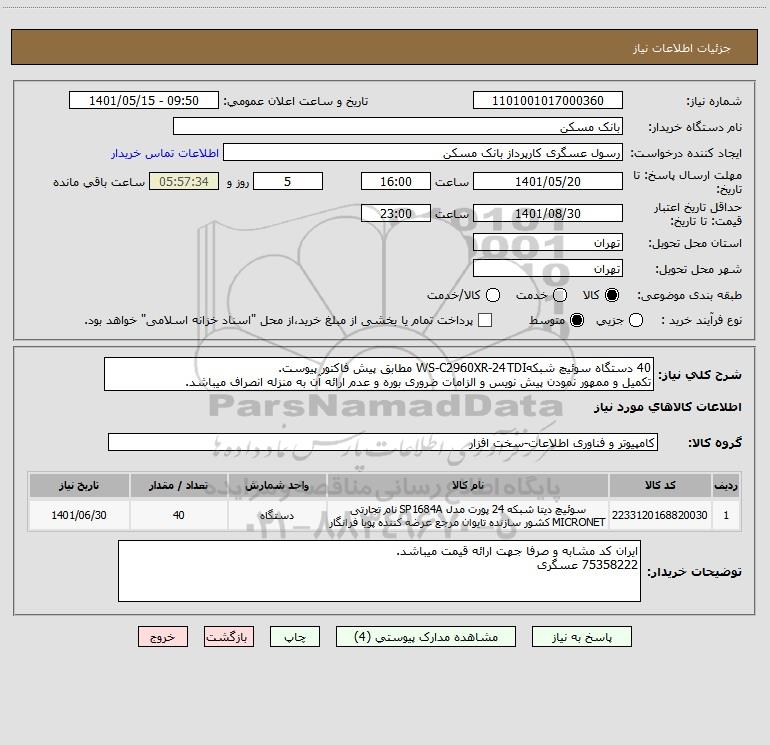 استعلام 40 دستگاه سوئیچ شبکهWS-C2960XR-24TDI مطابق پیش فاکتور پیوست. تکمیل و ممهور نمودن پیش نویس و الزامات ضروری بوره و عدم ارائه آن به منزله انصراف میباشد., استعلام 40 دستگاه سوئیچ شبکهWS-C2960XR-24TDI مطابق پیش فاکتور پیوست. تکمیل و ممهور نمودن پیش نویس و الزامات ضروری بوره و عدم ارائه آن به منزله انصراف میباشد.