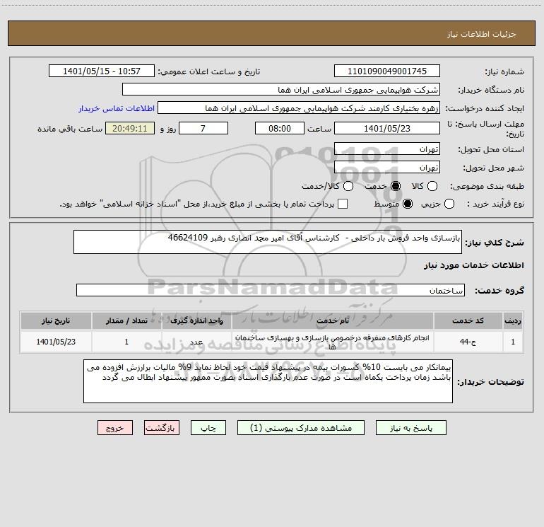 شرح کلی نیاز: بازسازی واحد فروش بار داخلی - کارشناس آقای امیر محمد انصاری رهبر 46624109
