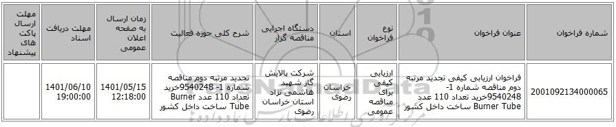 مناقصه، فراخوان ارزیابی کیفی تجدید مرتبه دوم مناقصه شماره 1- 9540248خرید تعداد 110 عدد Burner Tube ساخت داخل کشور, مناقصه، فراخوان ارزیابی کیفی تجدید مرتبه دوم مناقصه شماره 1- 9540248خرید تعداد 110 عدد Burner Tube ساخت داخل کشور