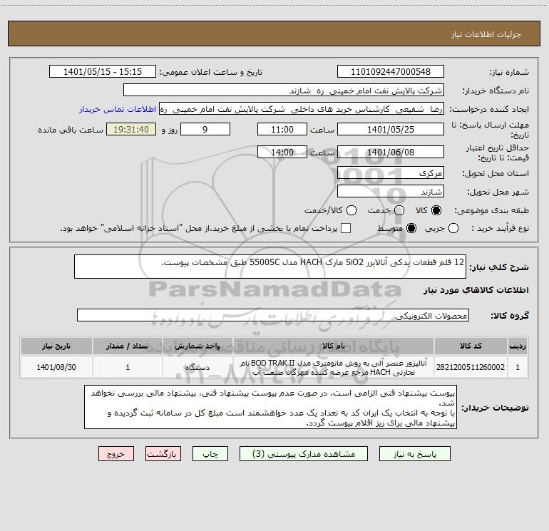 شرح کلی نیاز: 12 قلم قطعات یدکی آنالایزر SiO2 مارک HACH مدل 5500SC طبق مشخصات پیوست.