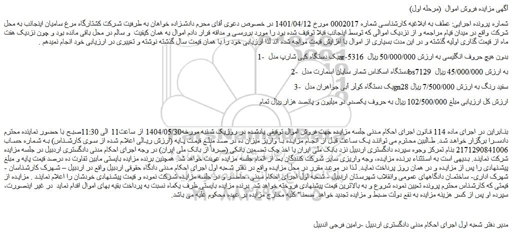 شماره پرونده اجرایی: عطف به ابلاغیه کارشناسی شماره 0002017 مورخ 1401/04/12 در خصوص دعوی آقای محرم دادشزاده خواهان به طرفیت شرکت کشتارگاه مرغ سامیان اینجانب به محل شرکت واقع در میدان قیام مراجعه و از نزدیک اموالی که توسط اینجانب قبلا توقیف شده بود را مورد بررسی و مداقه قرار دادم اموال به همان کیفیت و سالم در محل باقی مانده بود و چون نزدیک هفت ماه از قیمت گذاری اولیه گذشته و در این مدت بسیاری از اموال با افزایش قیمت مواجه شده اند لذا ارزیابی خود را با همان قیمت سال گذشته نوشته و تغییری در ارزیابی خود انجام نمیدهم .