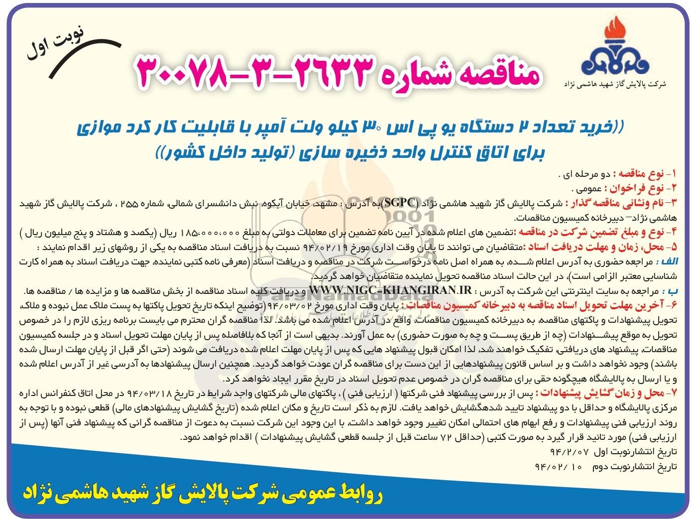 3- نام و نشانی مناقصه گذار: شرکت پالایش گاز شهید هاشمی نژاد SGPC به آدرس: مشهد ، خیابان آبکوه ، نبش دانشسرای شمالی، شماره 255 شرکت پالایش گاز شهید هاشمی نژاد ، دبیرخانه کمیسیون مناقصات.