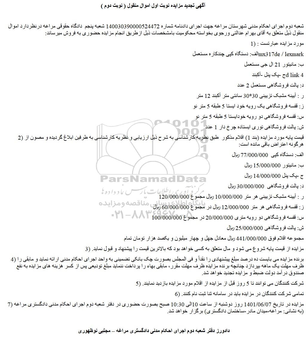 آگهی تجدید مزایده نوبت اول اموال منقول ( نوبت دوم )