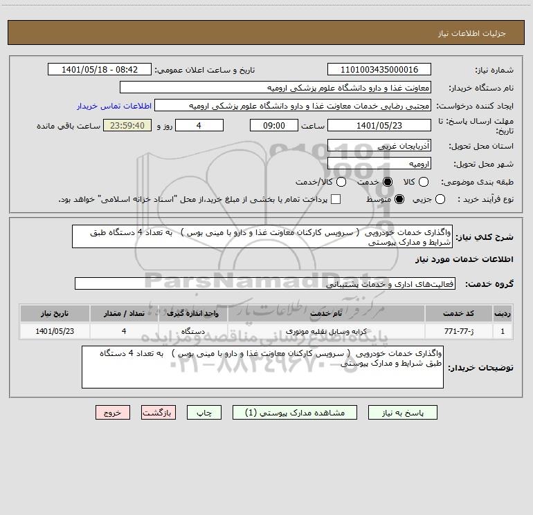 شرح کلی نیاز: واگذاری خدمات خودرویی ( سرویس کارکنان معاونت غذا و دارو با مینی بوس ) به تعداد 4 دستگاه طبق شرایط و مدارک پیوستی