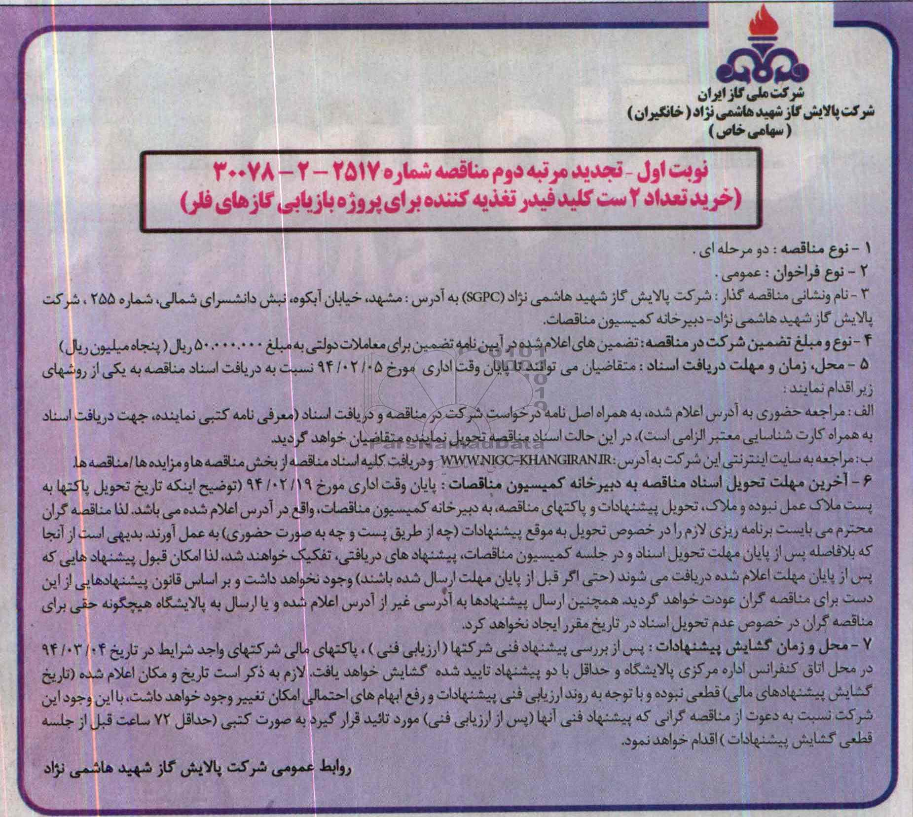نام و نشانی مناقصه گزار: شرکت پالایش گاز شهید هاشمی نژاد (PGPC) به آدرس: مشهد، خیابان آبکوه، نبش دانشسرای شماره 255، شرکت پالایش گاز شهید هاشمی نژاد- دبیرخانه کمیسیون مناقصات