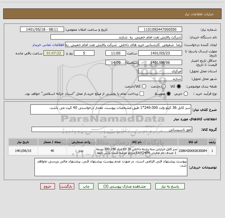 شرح کلی نیاز: سر کابل 36 کیلو ولت 300-240*1 طبق مشخصات پیوست. مقدار درخواستی 40 کیت می باشد.