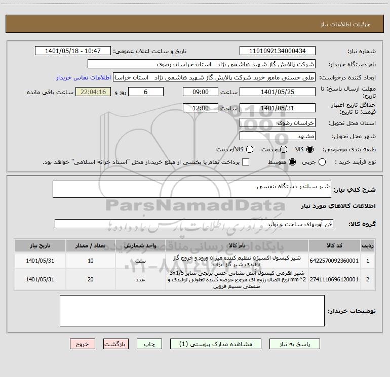 شرح کلی نیاز: شیر سیلندر دستگاه تنفسی