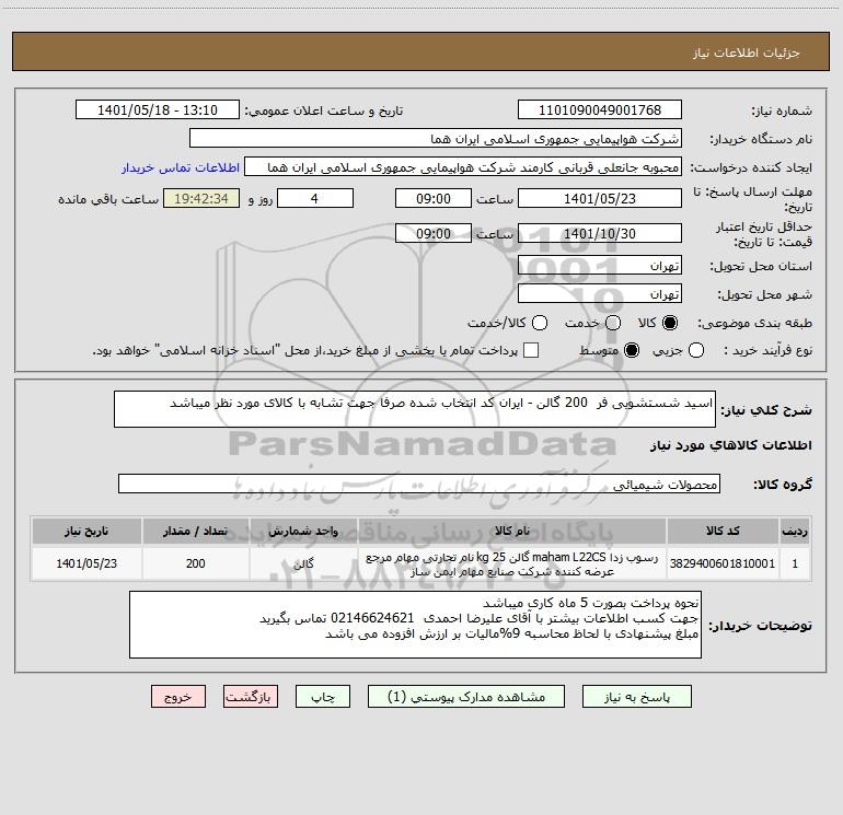 شرح کلی نیاز: اسید شستشویی فر 200 گالن - ایران کد انتخاب شده صرفا جهت تشابه با کالای مورد نظر میباشد