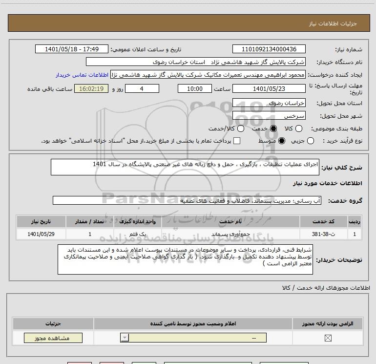 شرح کلی نیاز: اجرای عملیات تنظیفات ، بارگیری ، حمل و دفع زباله های غیر صنعتی پالایشگاه در سال 1401