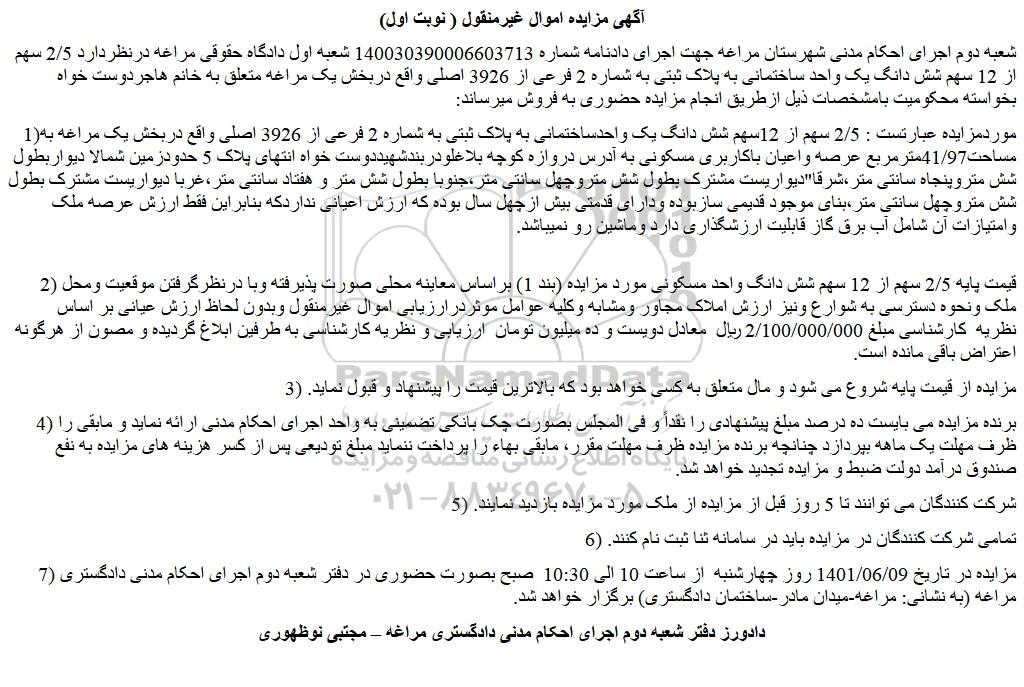 شعبه دوم اجرای احکام مدنی شهرستان مراغه جهت اجرای دادنامه شماره 140030390006603713 شعبه اول دادگاه حقوقی مراغه درنظردارد 2/5 سهم از 12 سهم شش دانگ یک واحد ساختمانی به پلاک ثبتی به شماره 2 فرعی از 3926 اصلی واقع دربخش یک مراغه متعلق به خانم هاجردوست خواه بخواسته محکومیت بامشخصات ذیل ازطریق انجام مزایده حضوری به فروش میرساند: