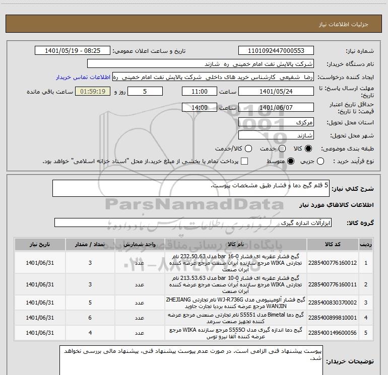 شرح کلی نیاز: 5 قلم گیج دما و فشار طبق مشخصات پیوست.