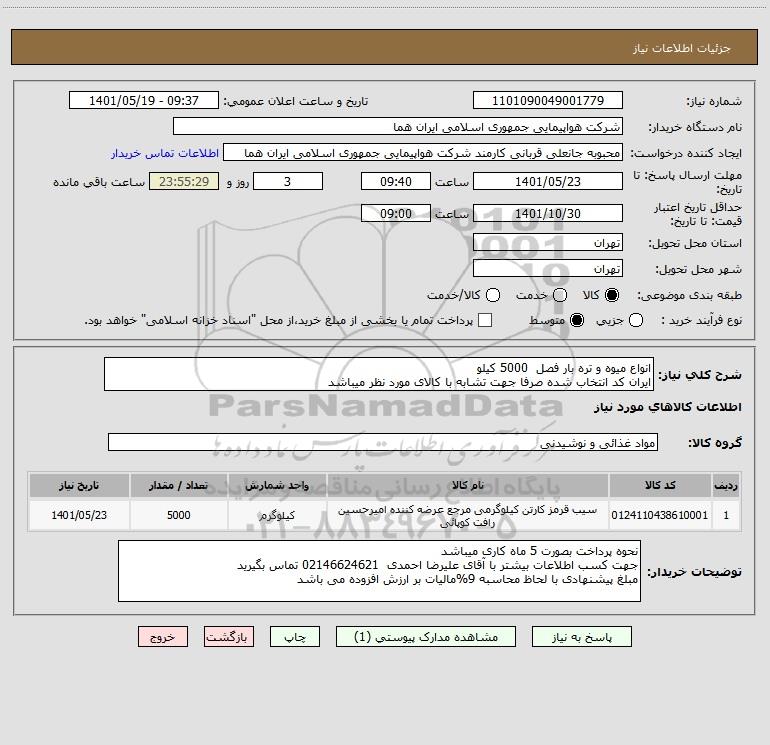 شرح کلی نیاز: انواع میوه و تره بار فصل 5000 کیلو