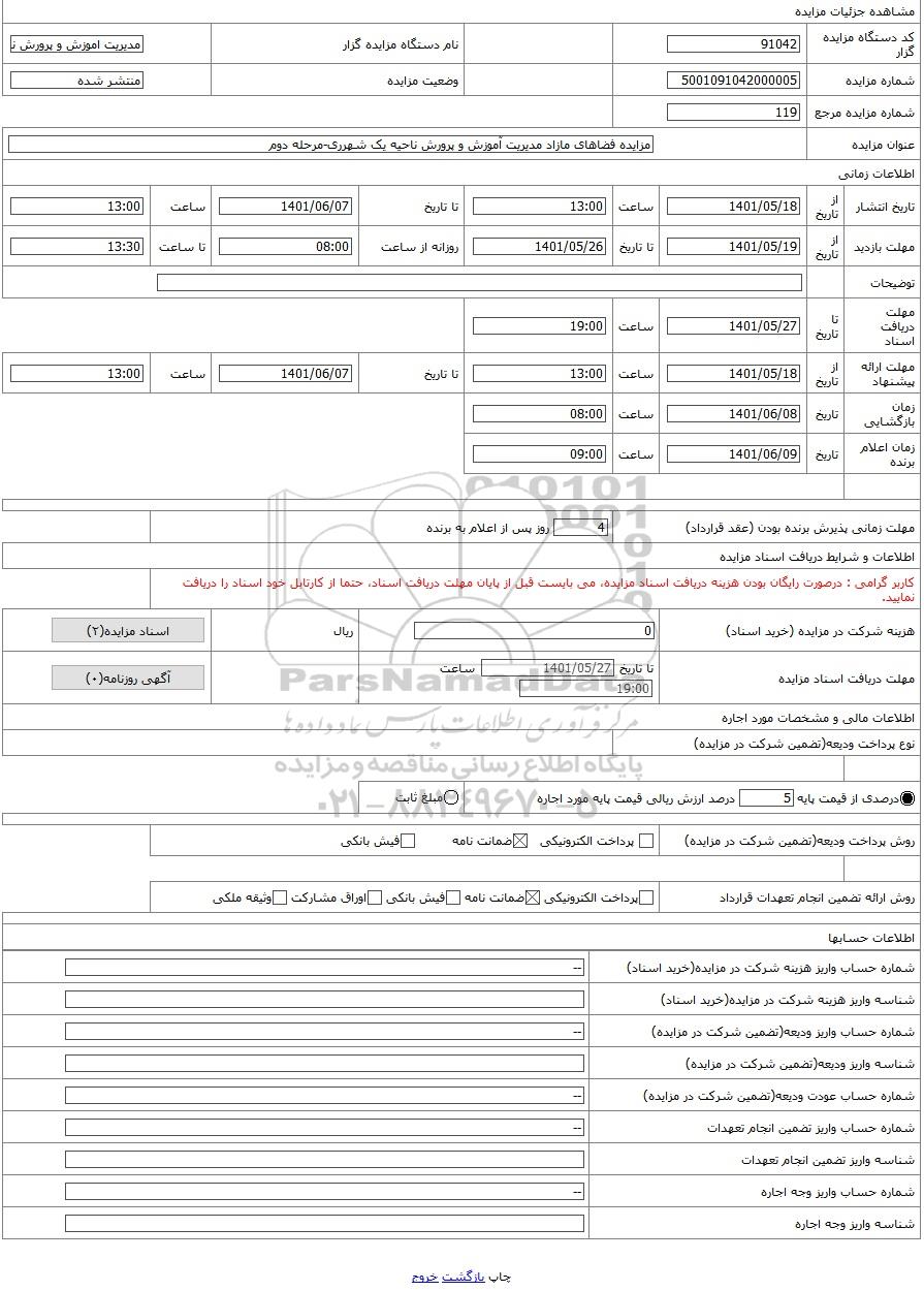 | شماره مورد اجاره | 5101091042000074 | نوع برگزاری مزایده | مزایده عمومی | |