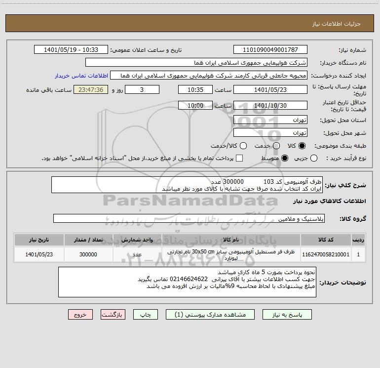 شرح کلی نیاز: ظرف آلومنیومی کد 103 300000 عدد