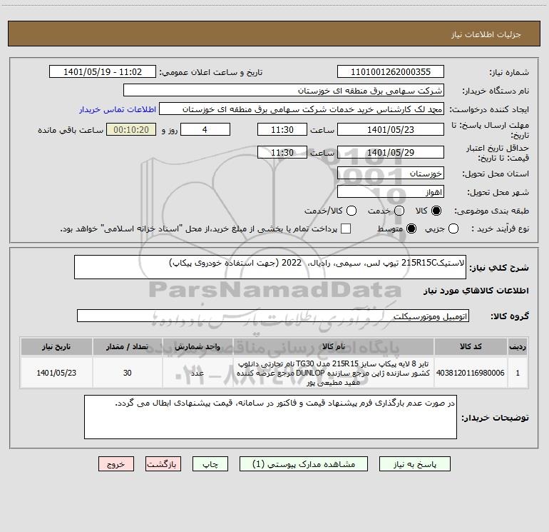 شرح کلی نیاز: لاستیک215R15C تیوپ لس، سیمی، رادیال، 2022 (جهت استفاده خودروی پیکاپ)