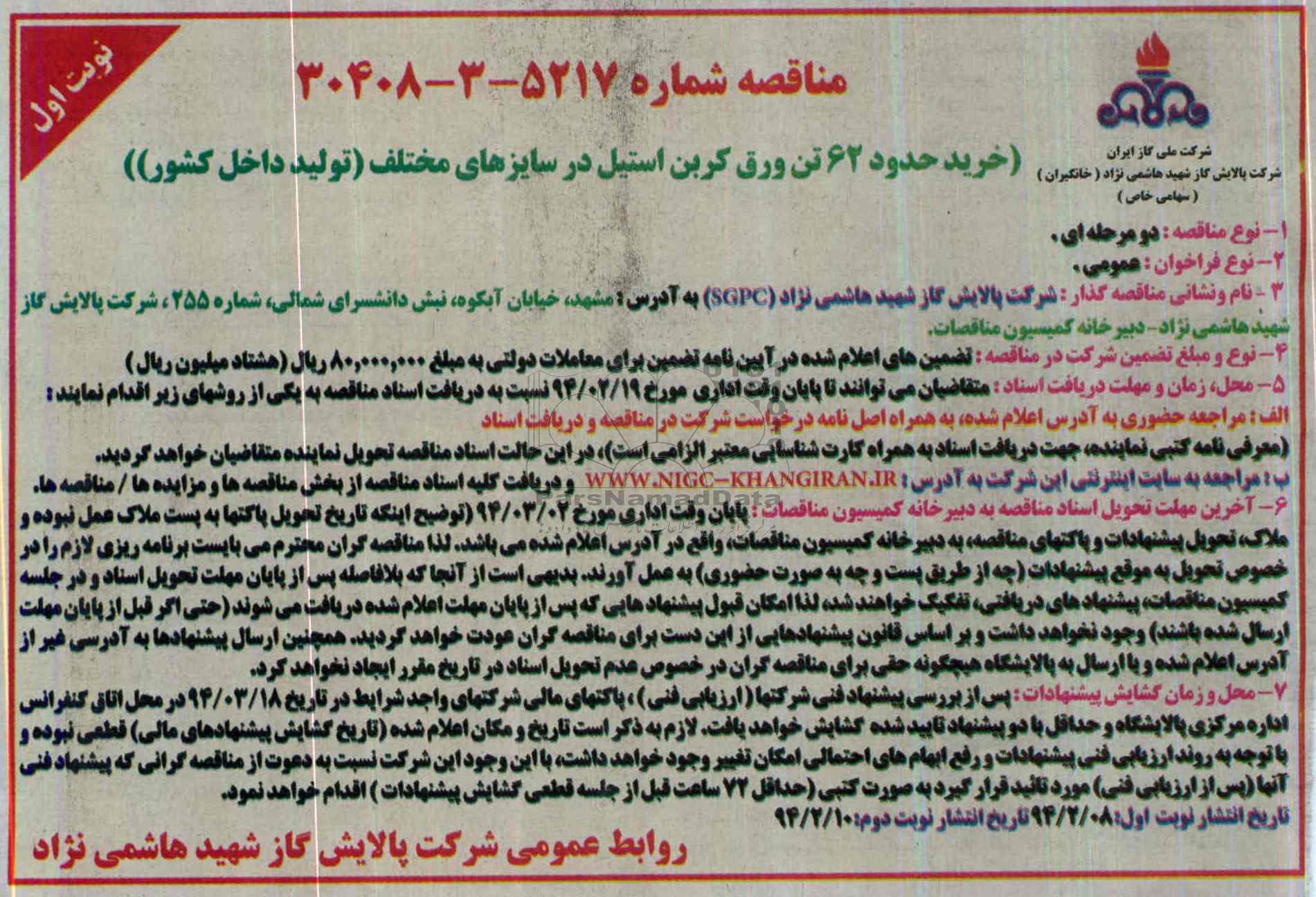 نام و نشانی مناقصه گذار: شرکت پالایش گاز شهید هاشمی نژاد ( SGPC) به آدرس: مشهد، خیابان آبکوه، نبش دانشسرای شمالی، شماره 255، شرکت پالایش گاز شهید هاشمی نژاد، دبیرخانه کمیسیون مناقصات