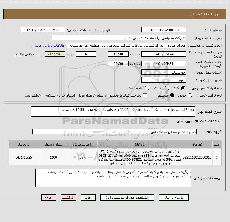 شرح کلی نیاز: ورق گالوانیزه ذوزنقه ای رنگ آبی با ابعاد 200*110 و ضخامت 0.5 به مقدار 1100 متر مربع