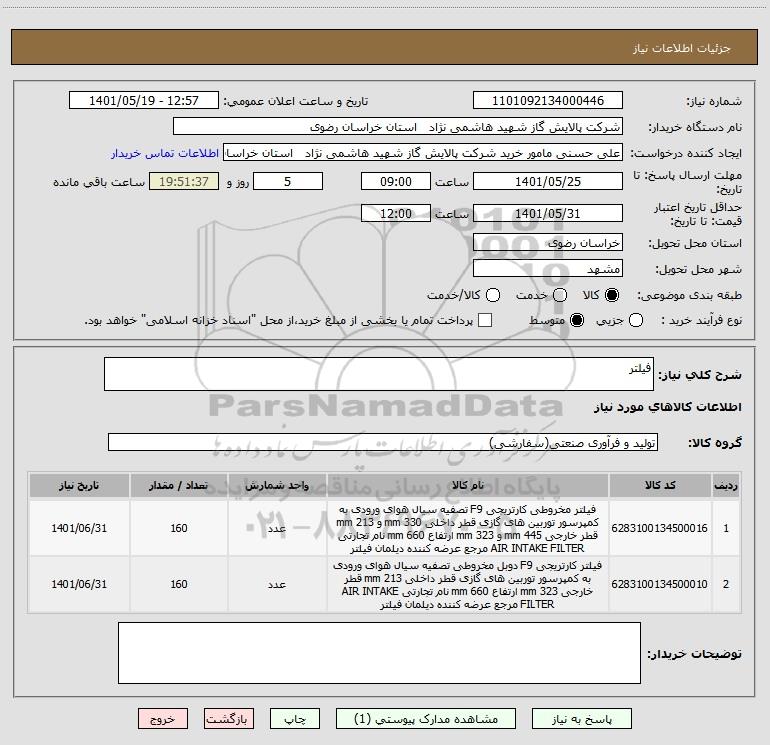 نام دستگاه خریدار:شرکت پالایش گاز شهید هاشمی نژاد استان خراسان رضوی