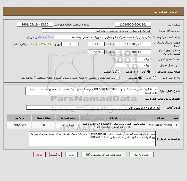 شرح کلی نیاز: تیوب با کارشناس هماهنگ شود PN:650X16 TUBE - ایران کد جهت تشابه است نحوه پرداخت بیست روز اداری است