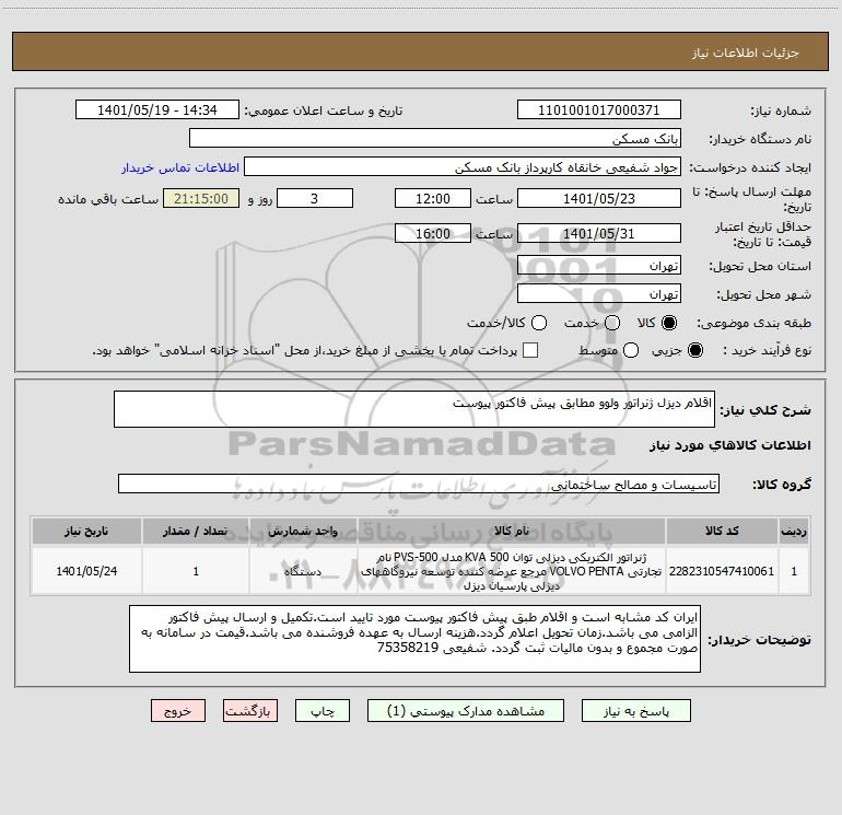 شرح کلی نیاز: اقلام دیزل ژنراتور ولوو مطابق پیش فاکتور پیوست